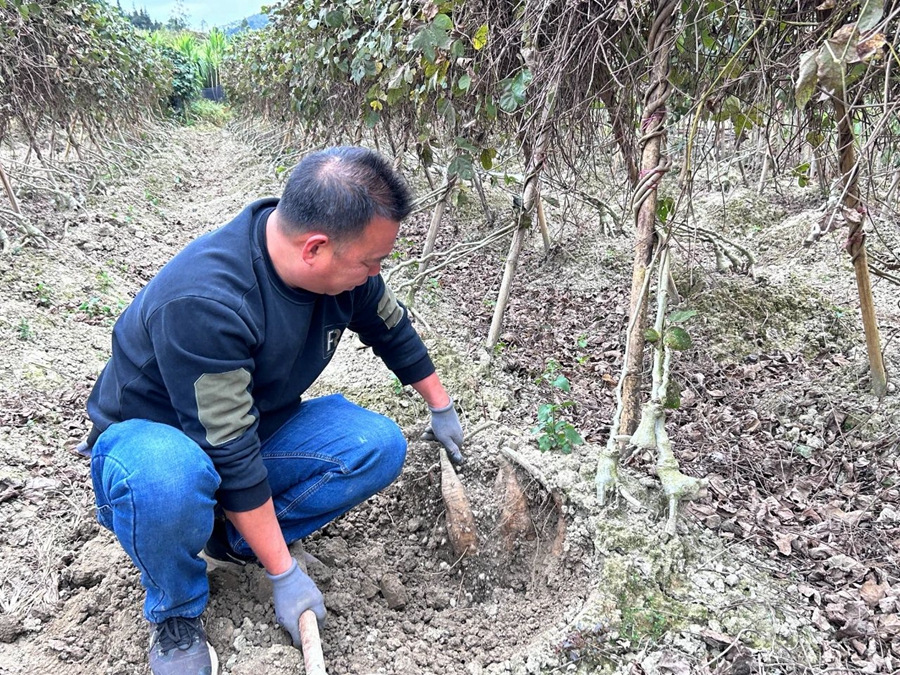 “一般情況下,每年3月份,農(nóng)戶們就開始種植粉葛,當(dāng)年11月底便可陸續(xù)采收!碑(dāng)?shù)胤鄹鸱N植大戶廖衛(wèi)光說,今年,他種有粉葛30多畝,畝產(chǎn)大概1000公斤。目前,粉葛市場行情較好,市場價每公斤約12元至16元。記者在廖衛(wèi)光家的粉葛種植地看到,成片的粉葛樹雖被霜打得葉子枯黃,但地下的粉葛大多飽滿粗壯。廖衛(wèi)光熟練地用鋤頭順著粉葛根莖的方向挖下去,一根粗壯結(jié)實(shí)的粉葛就從泥土中露了出來。