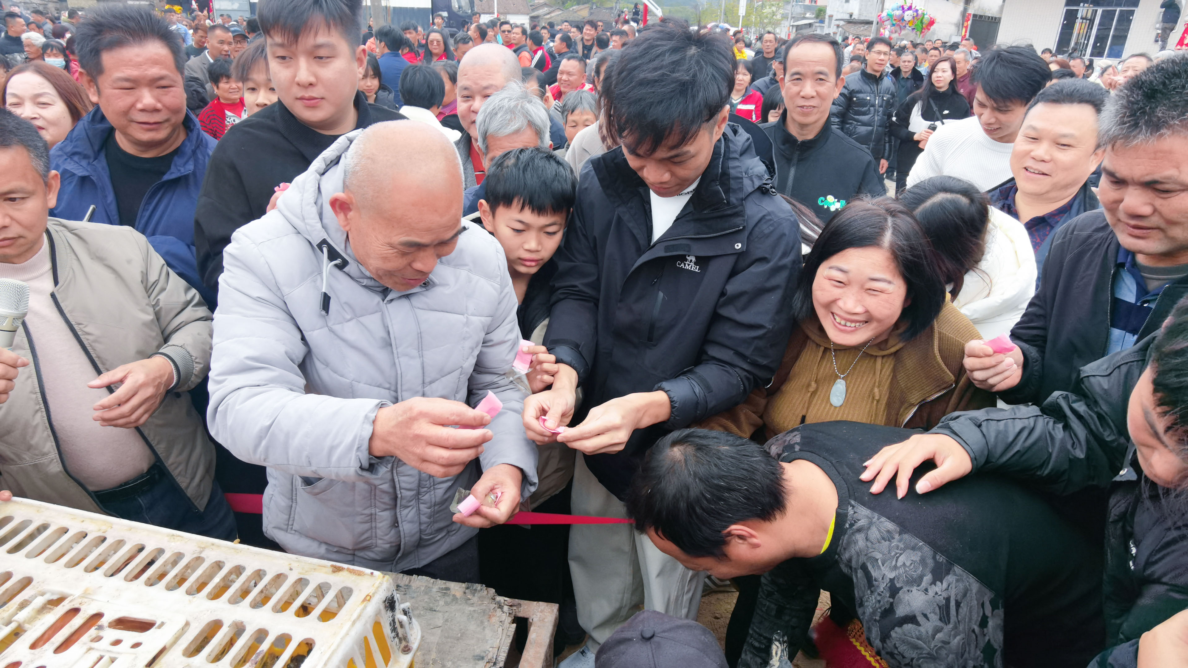 “啾—嘣”一聲,“炮頭”沖天而起,在空中劃過一道弧線飛向地面,參與者便一路歡笑拼命追炮、搶炮。隨著炮頭落下,一群人齊齊俯身搶拾,這一場(chǎng)面與橄欖球比賽的搶球畫面頗為相似。經(jīng)過一番激烈角逐,追炮搶炮的熱鬧場(chǎng)面結(jié)束,迎接大家的是兌換獎(jiǎng)品的激動(dòng)時(shí)刻。今年的獎(jiǎng)品,主辦方準(zhǔn)備了3只豬、10只鵝與20只雞,炮頭獲得者打開炮頭中夾帶的紙條,即可根據(jù)內(nèi)文所示兌換豐厚獎(jiǎng)品。