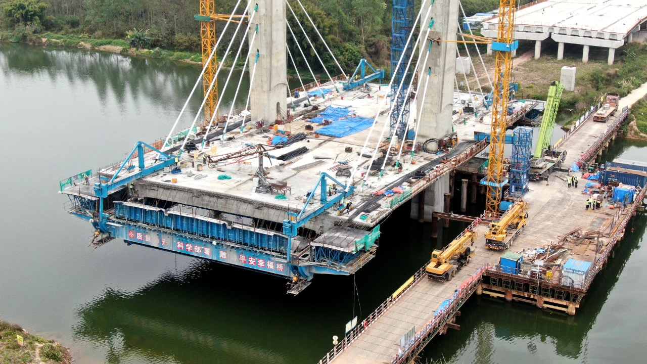 在龍門大橋新建項(xiàng)目現(xiàn)場,同樣是一派繁忙的景象。記者看到,大橋已經(jīng)基本成形,施工人員正在進(jìn)行主橋懸臂梁掛籃前移及鋼筋綁扎、引橋濕接縫、橫隔板施工等工作。