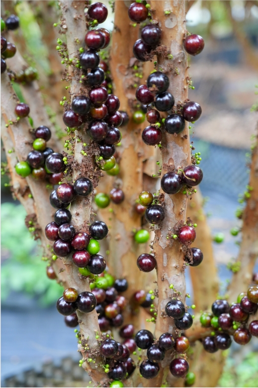 樹干上密密麻麻長(zhǎng)滿黝黑發(fā)紫的果子,外形像極了黑葡萄,這是有著“樹葡萄”之稱的嘉寶果。