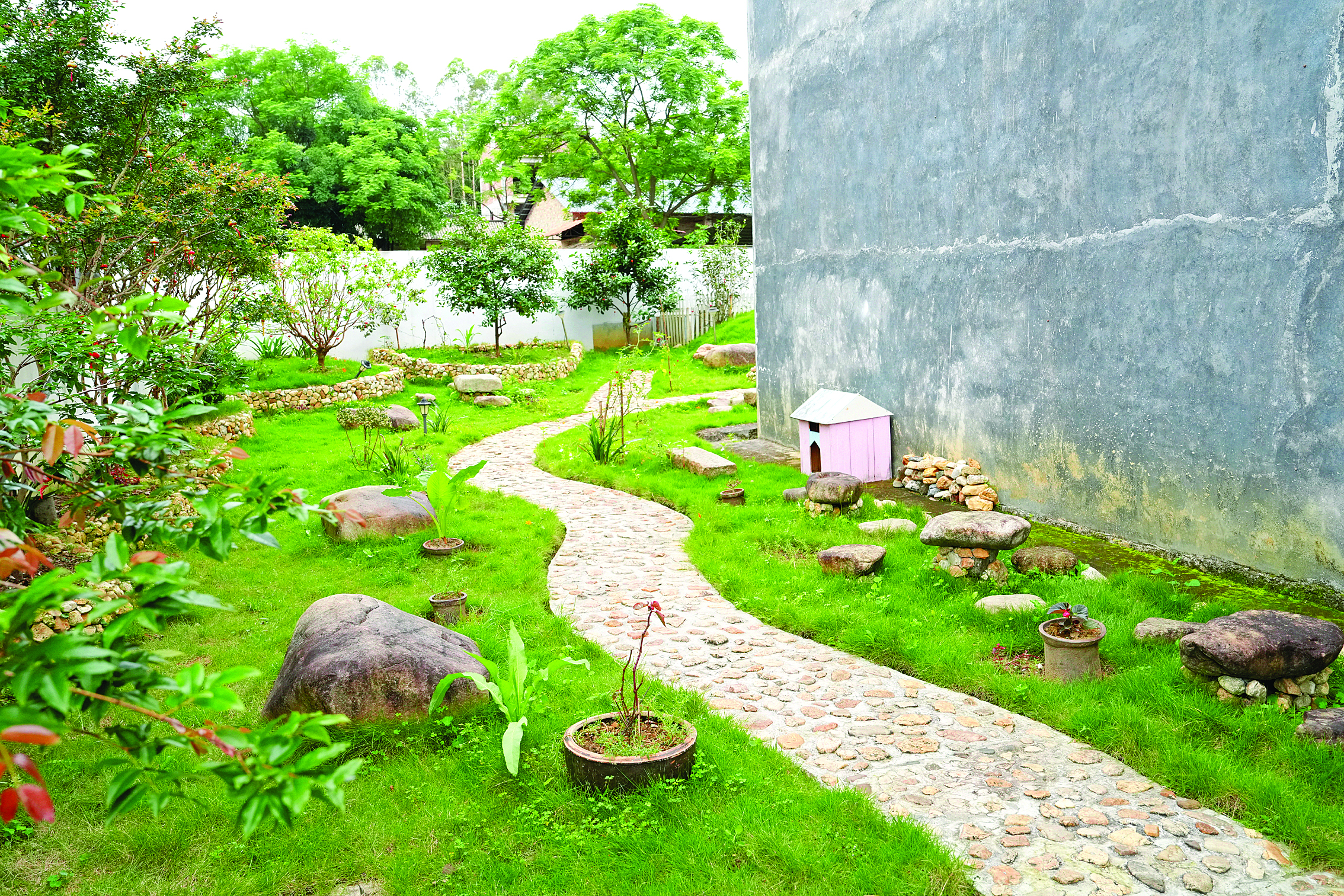 在龍?zhí)镦?zhèn)另一戶村民鐘志星家里,庭院里栽有各類花草,院子里的花壇、小徑、涼亭裝飾物等都用天然鵝卵石人工砌成,與花草灌木相映成趣,甚是好看。“我喜歡花草園藝,平時(shí)對(duì)園林設(shè)計(jì)也有所了解。前兩年長期待在家,有時(shí)間打理一下院子,我也是樂在其中!辩娭拘歉嬖V記者,庭院內(nèi)的每一處都是他一點(diǎn)一滴堆砌起來的。不僅是自家院子,鐘志星家門口的空地也在他和家人精心打造下,變身成為村里“口袋公園”,為大家提供了賞綠、享綠的好去處。