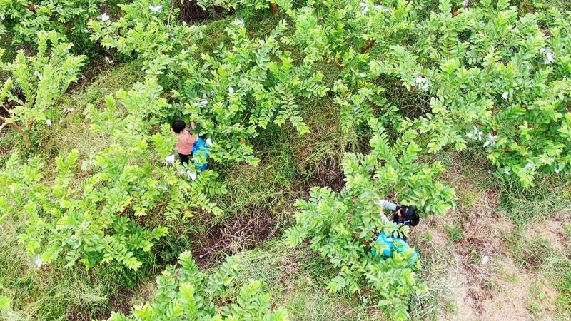 走進(jìn)種植基地,只見番石榴樹茂密成蔭,寬大的樹葉間掛滿了穿著白色“外套”的果實。下龍村村民陸醒明是該基地的負(fù)責(zé)人,種植番石榴已經(jīng)有4年。2020年,他通過承包村里的閑置撂荒地,整理出了這片適宜番石榴生長的地塊,開始了番石榴的種植之路。