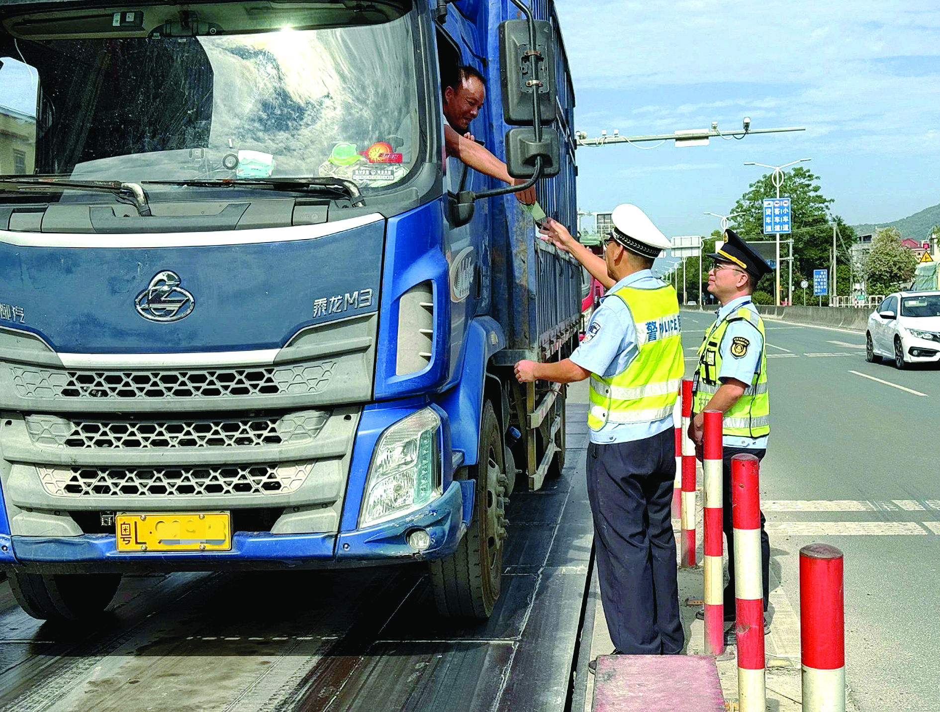 檢測(cè)站工作人員對(duì)進(jìn)入檢測(cè)區(qū)域的車輛進(jìn)行檢查。