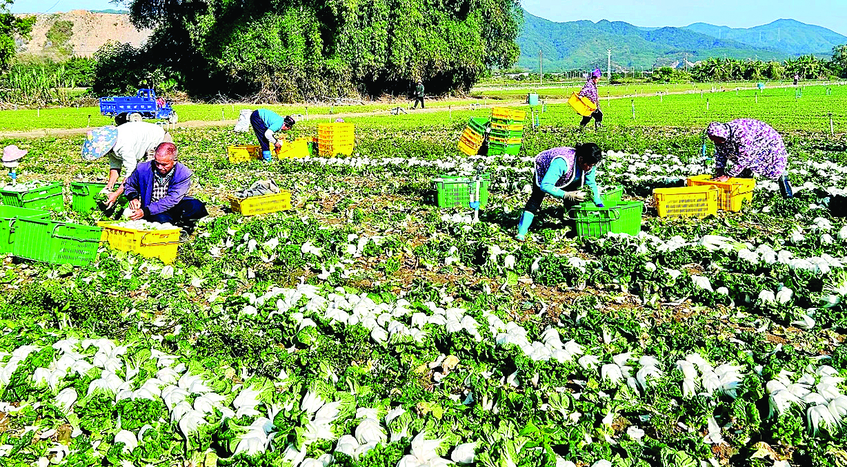 工人在田間采摘奶白菜。 惠州日報記者黃宇翔 通訊員龍融心 攝