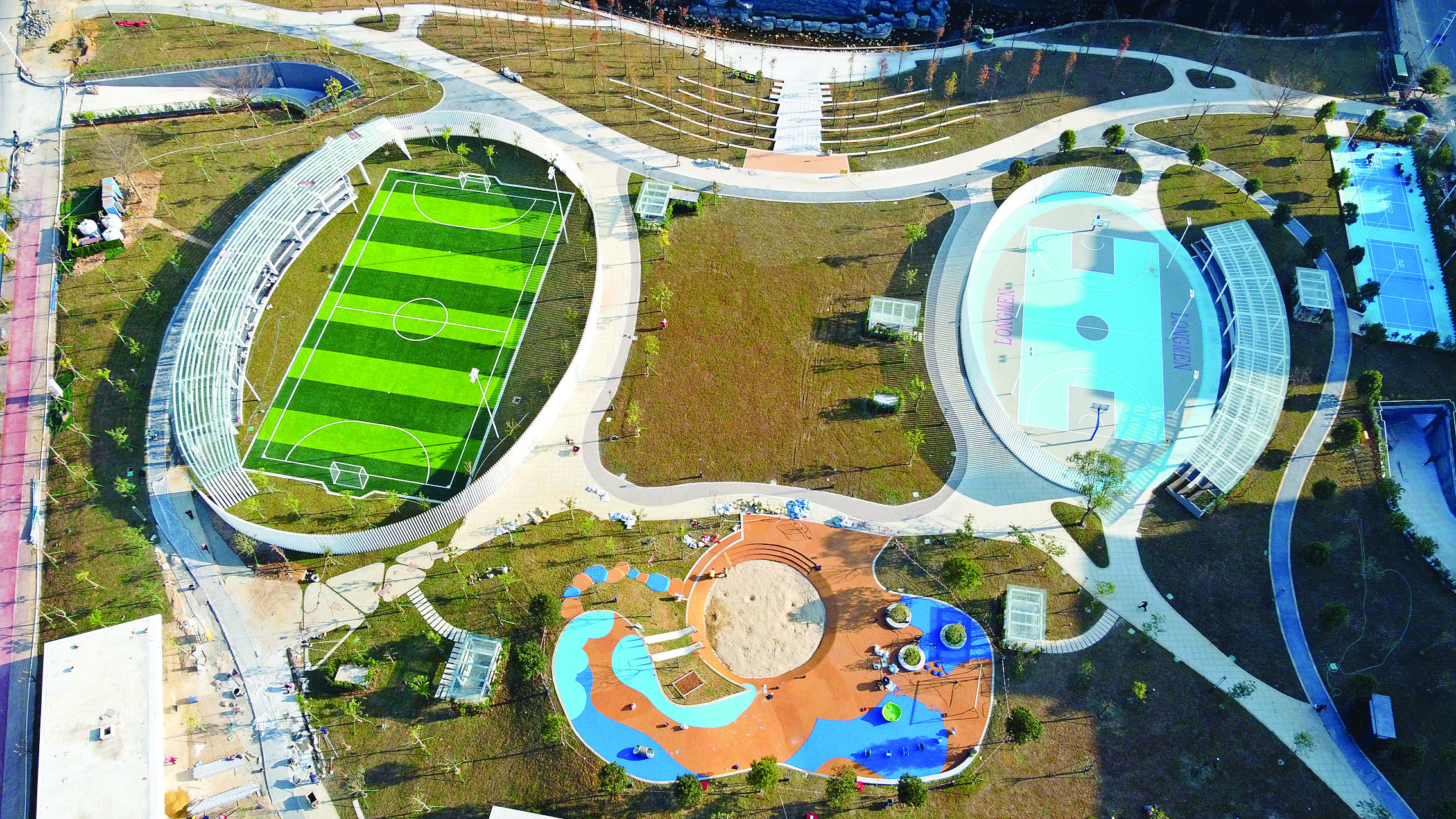 據(jù)介紹,游龍公園以打造“全年齡段市民的縣級綜合公園”為定位,按照“游龍之文韻,祈龍門之康樂”的設(shè)計理念開展建設(shè)。公園占地面積約4萬平方米,涵蓋文化體驗區(qū)、疏林活動區(qū)、運動健身區(qū)、濱水休閑區(qū)四大片區(qū),園內(nèi)設(shè)有戶外小廣場、公共運動場、休閑綠地、人行路徑以及兒童友好公園設(shè)施等多層次的景觀空間。同時,公園還建設(shè)了面積約13300平方米的半地下停車庫,共設(shè)有470個車位。