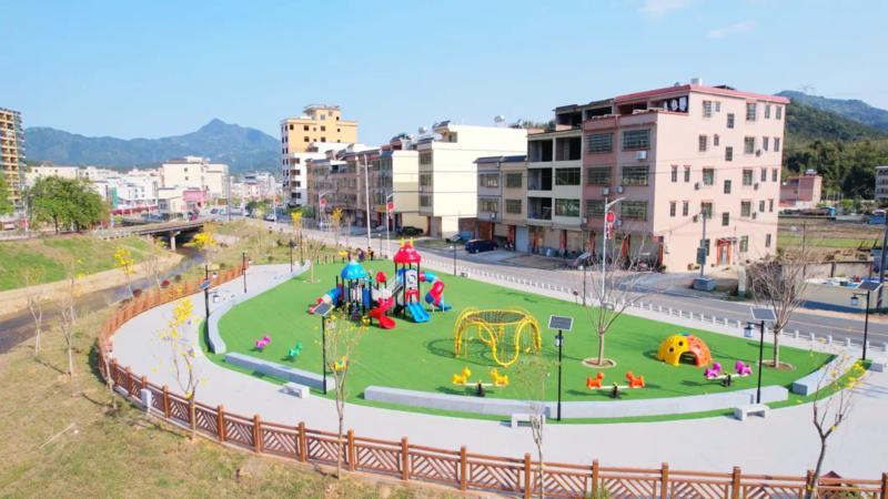 地派鎮(zhèn)還充分利用圩鎮(zhèn)中心閑置荒地,科學(xué)布局,新建綠美生態(tài)小公園。公園總面積約2.1萬平方米,綠化面積占比約70%。公園內(nèi)配備滑梯、秋千,為兒童設(shè)置安全的游樂區(qū);設(shè)置籃球場(chǎng)、乒乓球場(chǎng)、健身器材等,為成年人打造健身活動(dòng)區(qū)。沿河建設(shè)的慢行步道巧妙串聯(lián)起公園各個(gè)功能區(qū)與特色景觀節(jié)點(diǎn)。