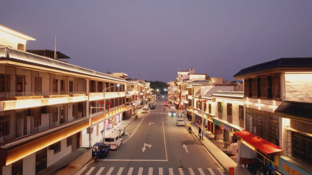 夜幕降臨,龍?zhí)钝捉值囊咕盁艄饬疗,點(diǎn)燃圩鎮(zhèn)新活力。