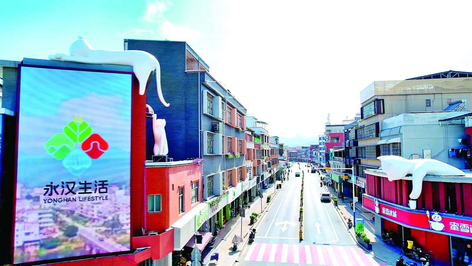 駛過永漢橋,便來到了美麗示范主街增龍路段。這里道路平坦整潔,車輛有序穿梭。街道兩旁的房屋經(jīng)過“一棟一設(shè)計”的精心改造,風格協(xié)調(diào)統(tǒng)一。而最吸引人的,當屬隱藏在各處的“豹貓”元素。這些以當?shù)囟壉Wo動物豹貓為原型打造的景觀設(shè)施,或在奶茶店樓頂俏皮張望,或在樓房間歡快嬉戲,憨態(tài)可掬的模樣引得游客駐足拍照。
