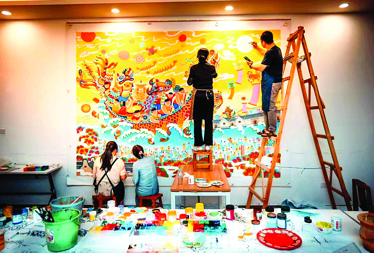 《潮涌南粵》是一幅長3.5米、寬2.5米的巨型畫作,以濃烈的色彩和極具張力的構(gòu)圖,展現(xiàn)廣東龍門底蘊深厚的民俗文化與新時代的蓬勃氣象。畫作中,傳統(tǒng)嶺南元素與現(xiàn)代化符號交相輝映,激昂的賽龍舟、歡騰的舞春牛、雄健的醒獅、靈動的舞鳳等民俗場景栩栩如生,與象征科技發(fā)展的無人機群、承載歷史記憶的鑊耳樓建筑融為一體,形成一幅跨越時空的鄉(xiāng)土畫卷。