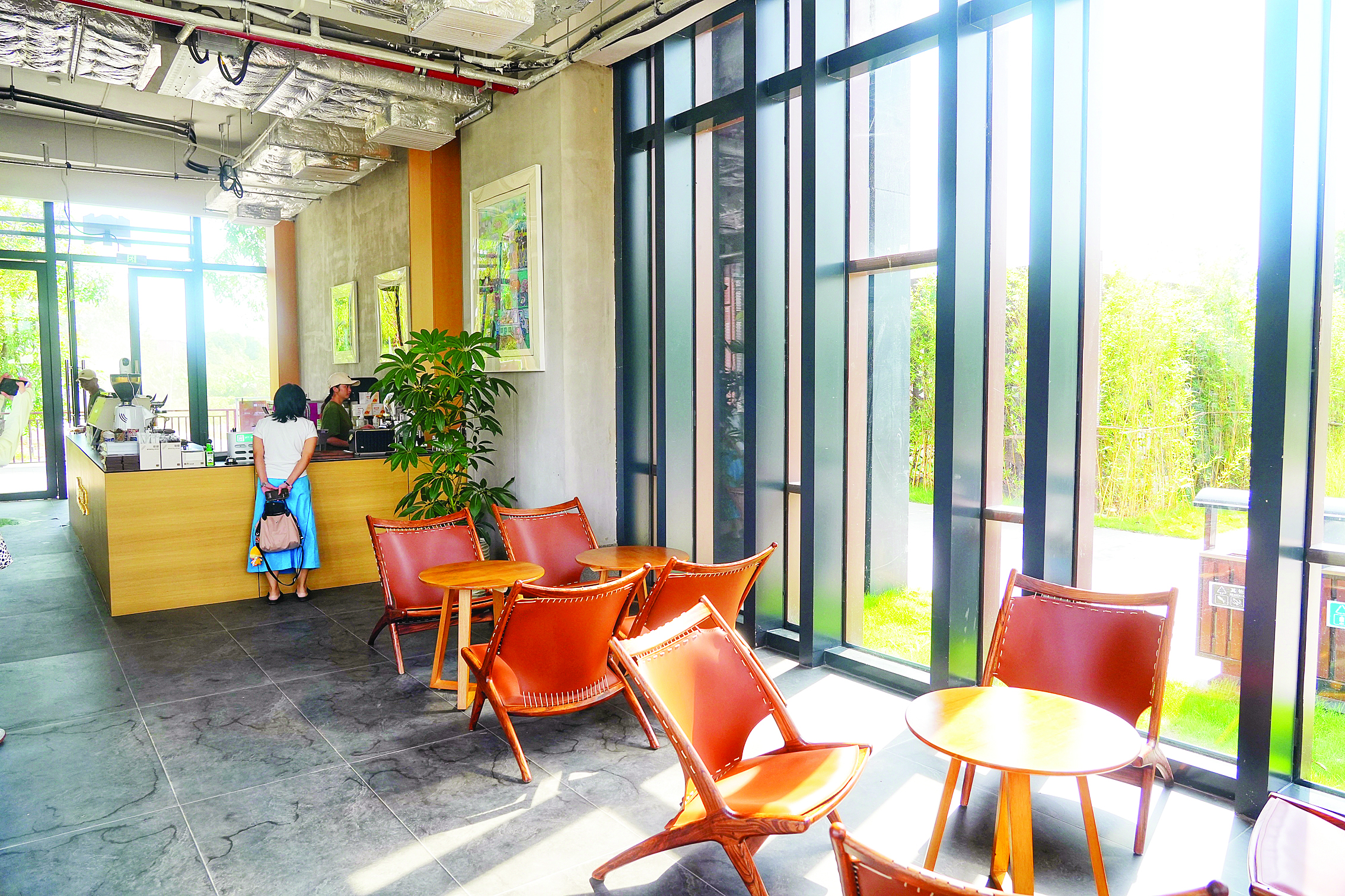 走進(jìn)驛站內(nèi)部,更是處處藏著“東坡樂事”的巧思。一層的休閑區(qū)里,“花魁”“水拓長煙”等特色咖啡的香氣彌漫,不少游客坐在臨窗的位置,一邊啜飲咖啡,一邊欣賞窗外的河景!耙郧翱傆X得‘古榕聽琴’‘竹窗夜話’是詩詞里的場景,沒想到在這里能坐著喝咖啡、看河景,這種閑適感和詩里寫的一模一樣!眮碜陨钲诘挠慰屠钆颗e著咖啡杯,笑著和同伴分享感受。