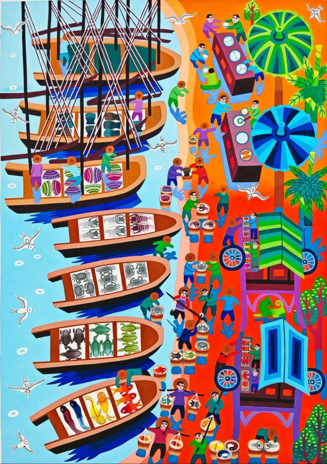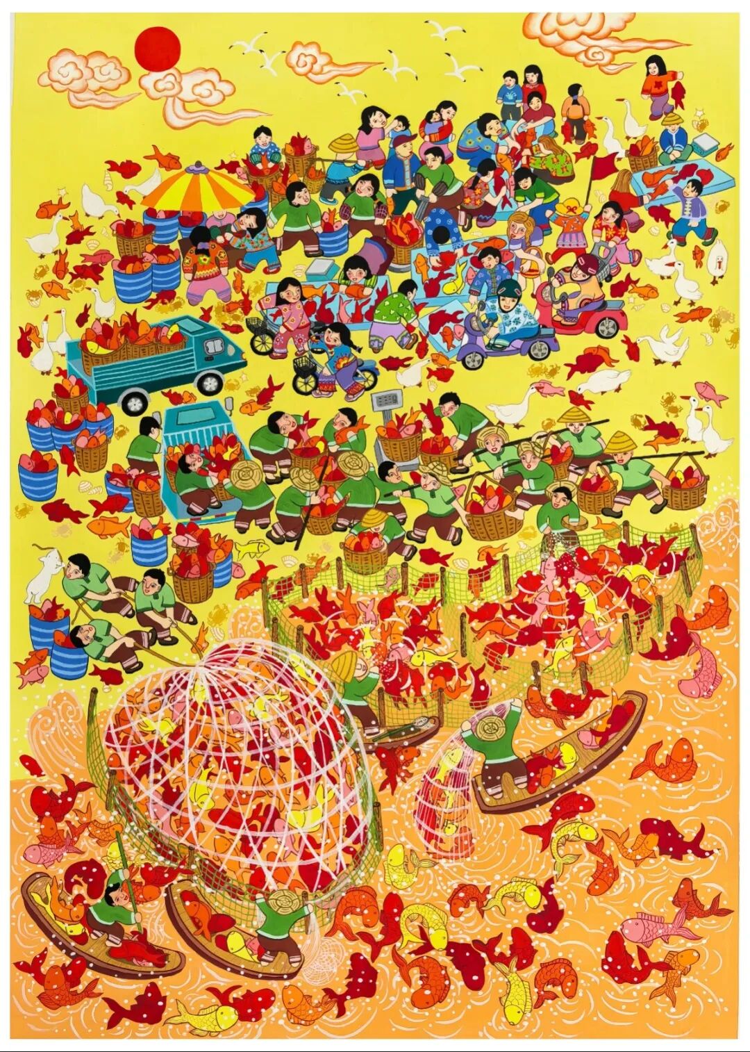 作為“中國現(xiàn)代民間繪畫畫鄉(xiāng)”“中國民間文化藝術(shù)之鄉(xiāng)”,龍門農(nóng)民畫多年來堅(jiān)持以濃墨重彩記錄生活本真,用質(zhì)樸筆觸傳遞鄉(xiāng)土情懷。此次入選的4幅作品,延續(xù)了當(dāng)?shù)剞r(nóng)民畫色彩明艷、構(gòu)圖飽滿的藝術(shù)特色,既聚焦嶺南農(nóng)事節(jié)慶、漁鄉(xiāng)市集等傳統(tǒng)題材,又融入新時(shí)代鄉(xiāng)村振興的鮮活氣息,把勞動(dòng)的喜悅、豐收的盛景和群眾對(duì)美好生活的向往,實(shí)實(shí)在在地畫在了紙上,成為嶺南民俗文化的生動(dòng)寫照。