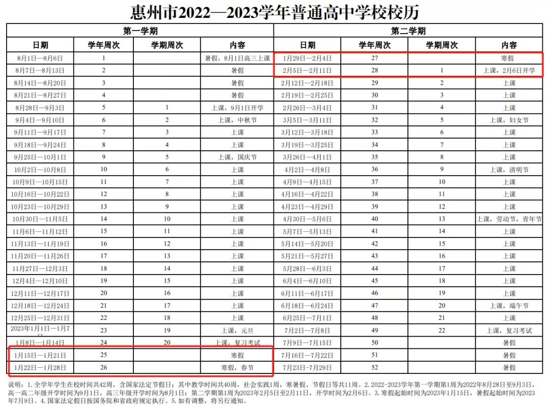 惠州市普通高中寒假起始時間為2023年1月15日開始;開學(xué)時間為2月6日。