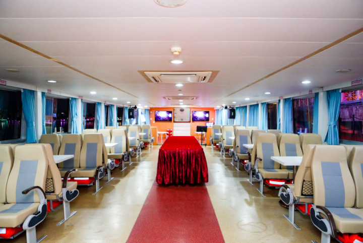 “東江游”游船可載客162人,船高三層,一層是觀光表演艙,二層是貴賓艙、三層是休閑觀光平臺(tái)。游船配有專業(yè)舞臺(tái)燈光音響、卡拉OK、飲品、小吃、移動(dòng)投影儀等專業(yè)會(huì)議設(shè)備。可接待100~150人的包船業(yè)務(wù),適合休閑旅游、商務(wù)接待、品牌發(fā)布、生日派對(duì)、水上婚禮、企業(yè)慶典、私人訂制等。
