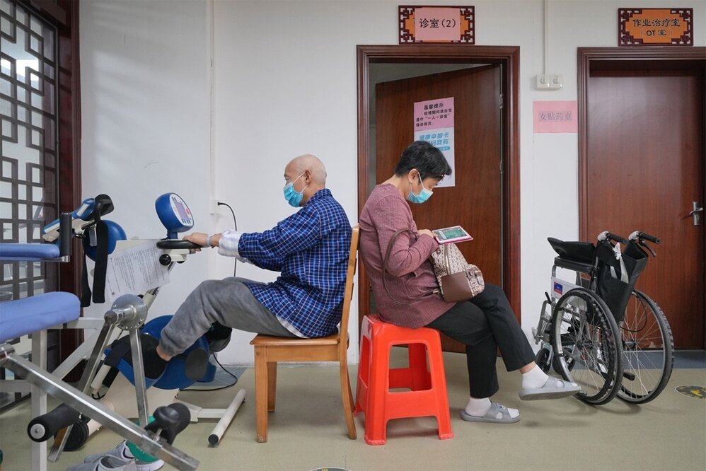2022年1月14日,惠東縣中醫(yī)醫(yī)院一處康復(fù)設(shè)備前,兩位老人相互陪伴。