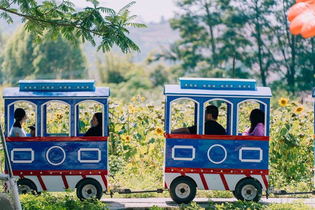 2022年4月4日,博羅湖鎮(zhèn),游客乘坐小火車欣賞農(nóng)業(yè)公園美景。