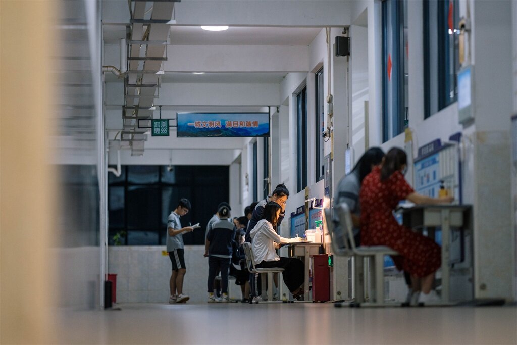 2022年4月14日,惠州中學(xué)晚自習(xí)的樓道上,師生們在燈下奮戰(zhàn)。