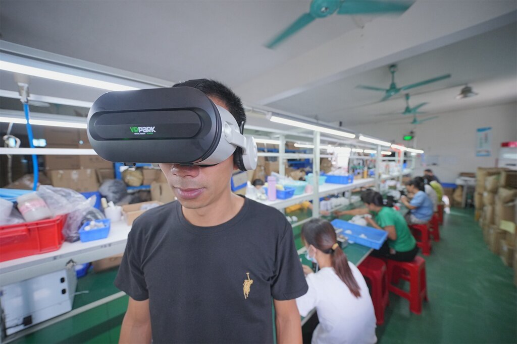 2022年6月30日,麻陂鎮(zhèn)一家村辦扶貧工廠的生產(chǎn)線,工人正在測試出口東歐的平價VR設(shè)備。