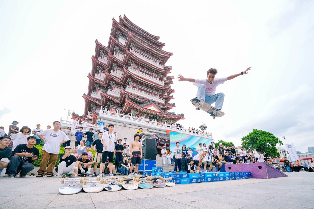 2022年7月16日,一位滑板運動員從惠州合江樓下飛躍而過。