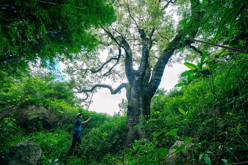 2022年8月22日,象頭山林場楓香古樹,樹干巨大,巨大的樹干分出5條粗壯的枝丫向四周延伸,從下往上看,整棵樹就像一個巨大的爪子。