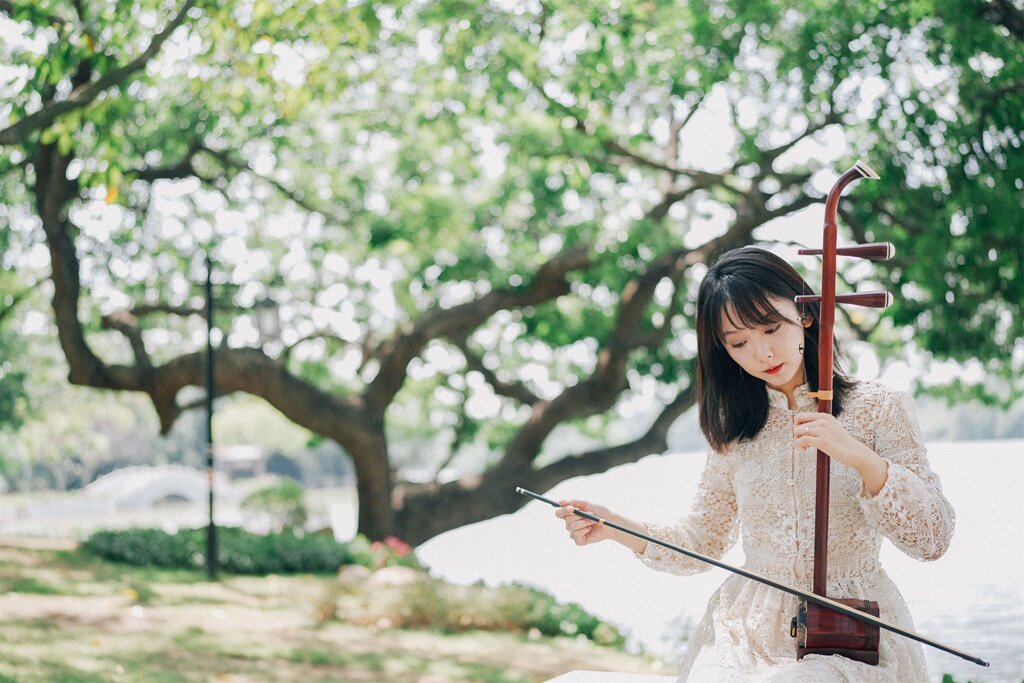2022年10月5日, 一名女孩在西湖邊練習(xí)二胡。