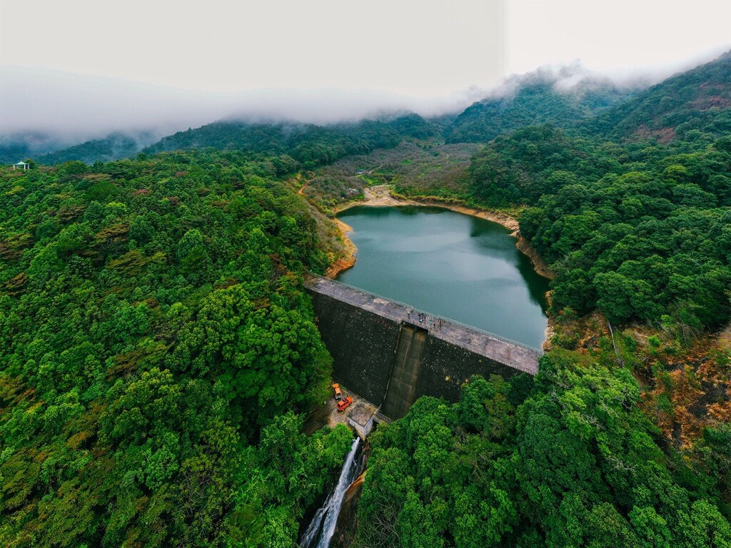 2022年11月4日,航拍平安林場的水庫和瀑布。