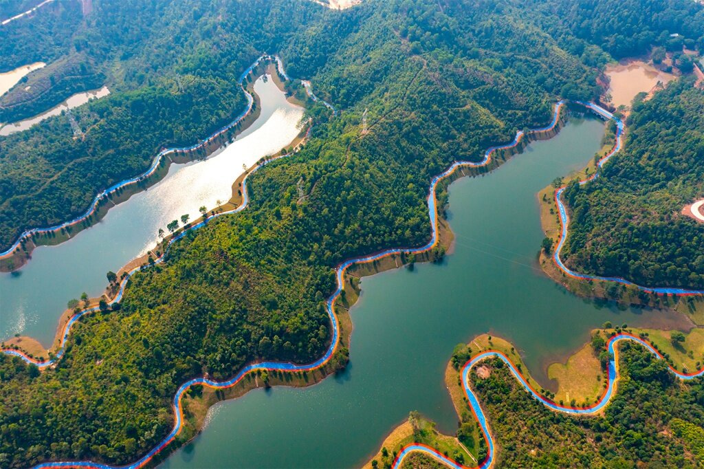2022年11月15日,航拍東江林場激流坑水庫,陽光下的熒光綠道。
