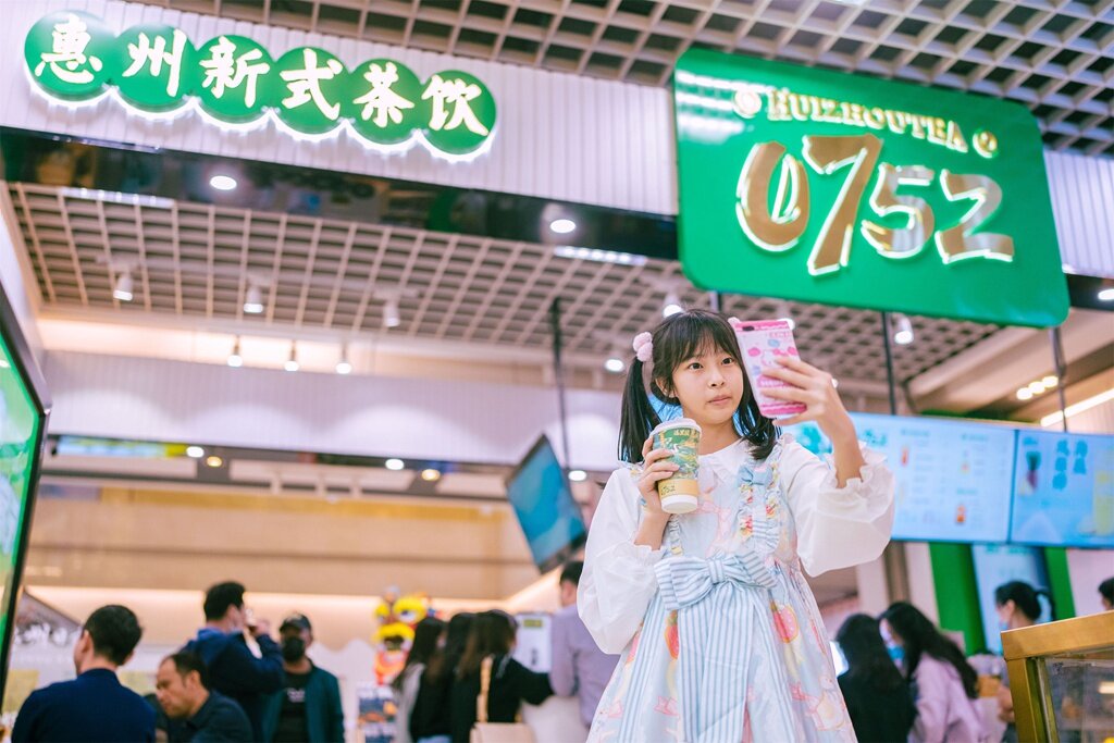 2022年11月30日,惠州日報旗下“0752”奶茶正式上市,一名身著洛麗塔服裝的年輕人在店門前打卡。