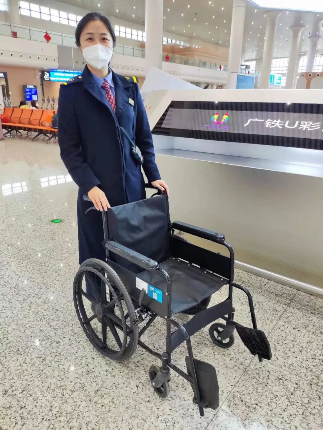 為滿足特殊重點旅客出行需求,惠州北站與團市委聯(lián)手開展了志愿幫扶服務,在售票廳、檢票口、服務臺設置志愿服務隊,為特殊重點旅客提供全鏈條、全過程愛心服務。其中,站內設置了兩臺輪椅,可為行動不便的旅客,提供免費服務。謝林珂:“惠州北站是有設置輪椅的,比如說有一些旅客行動不便,可以打12306預約,或者到現(xiàn)場跟我們工作人員提出相應的訴求,然后我們會推輪椅到進站口,將旅客迎接進站,然后核對完旅客出行的車次,送達列車車廂門口跟列車長進行交接。并且和列車長交接完之后,我們也會通知到站那邊的客運服務人員,進行一個延伸服務,到站也可以提供輪椅,把旅客接送出站,交給他的那個接站的家屬。”