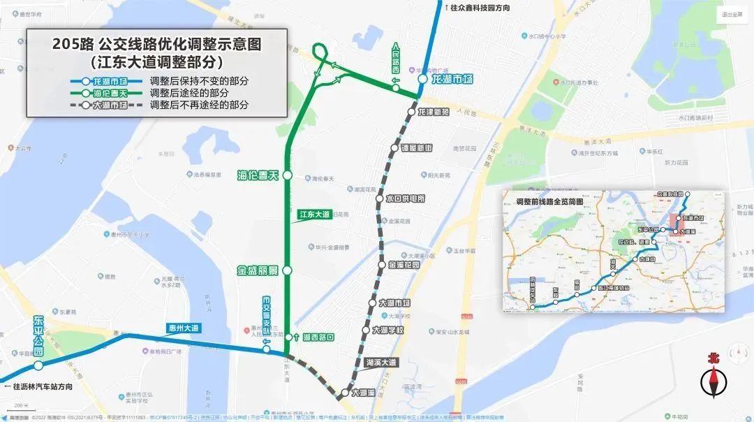 取消205路龍湖大道、湖溪大道、惠州大道部分路段,調(diào)整線路改由龍湖市場(chǎng)經(jīng)人民路西段、江東大道至市交警支隊(duì)接回原線路。