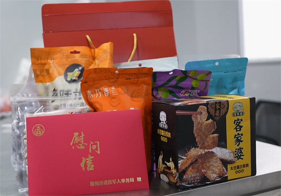 打開喜慶的外包裝,里面開心果、米餅、芝麻糕、梅菜酥餅等年貨,品種豐富,年味十足,還有不少是惠州本地特產(chǎn)“惠州手信”。此外,還有一封慰問信和兔年大吉新春賀卡。