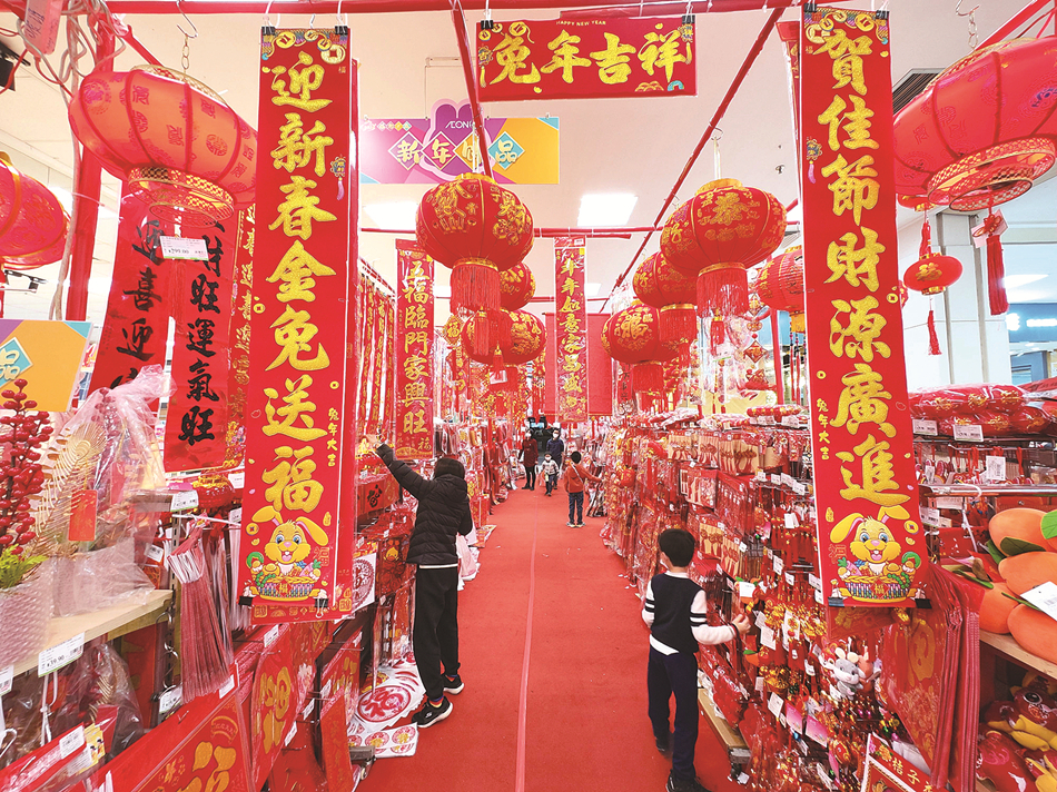 花市里,各種喜慶的裝飾物品應(yīng)有盡有。