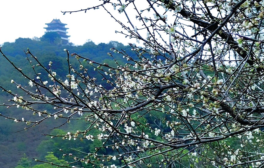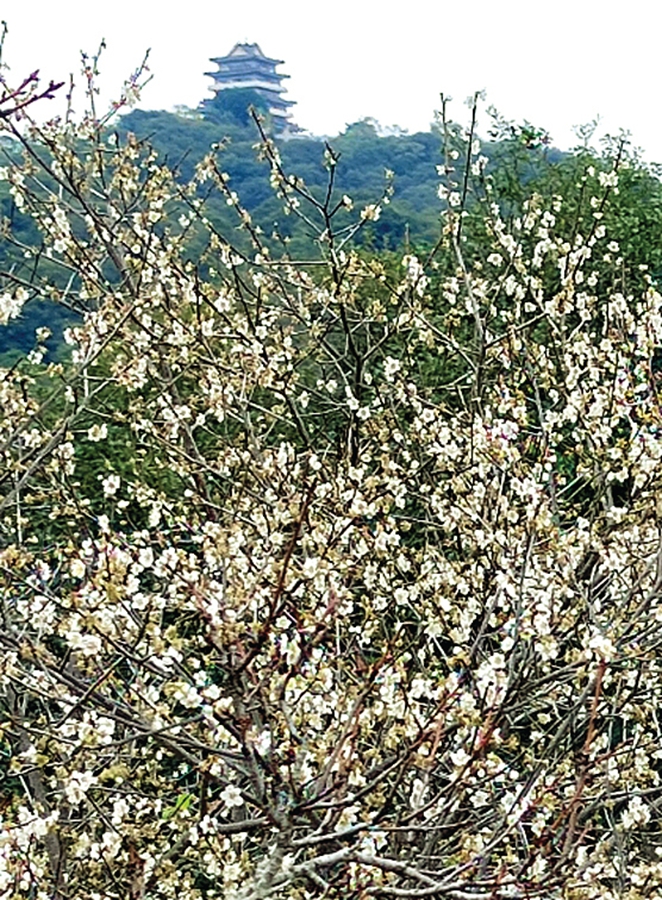透過花海,看到遠(yuǎn)處高榜山的掛榜閣。