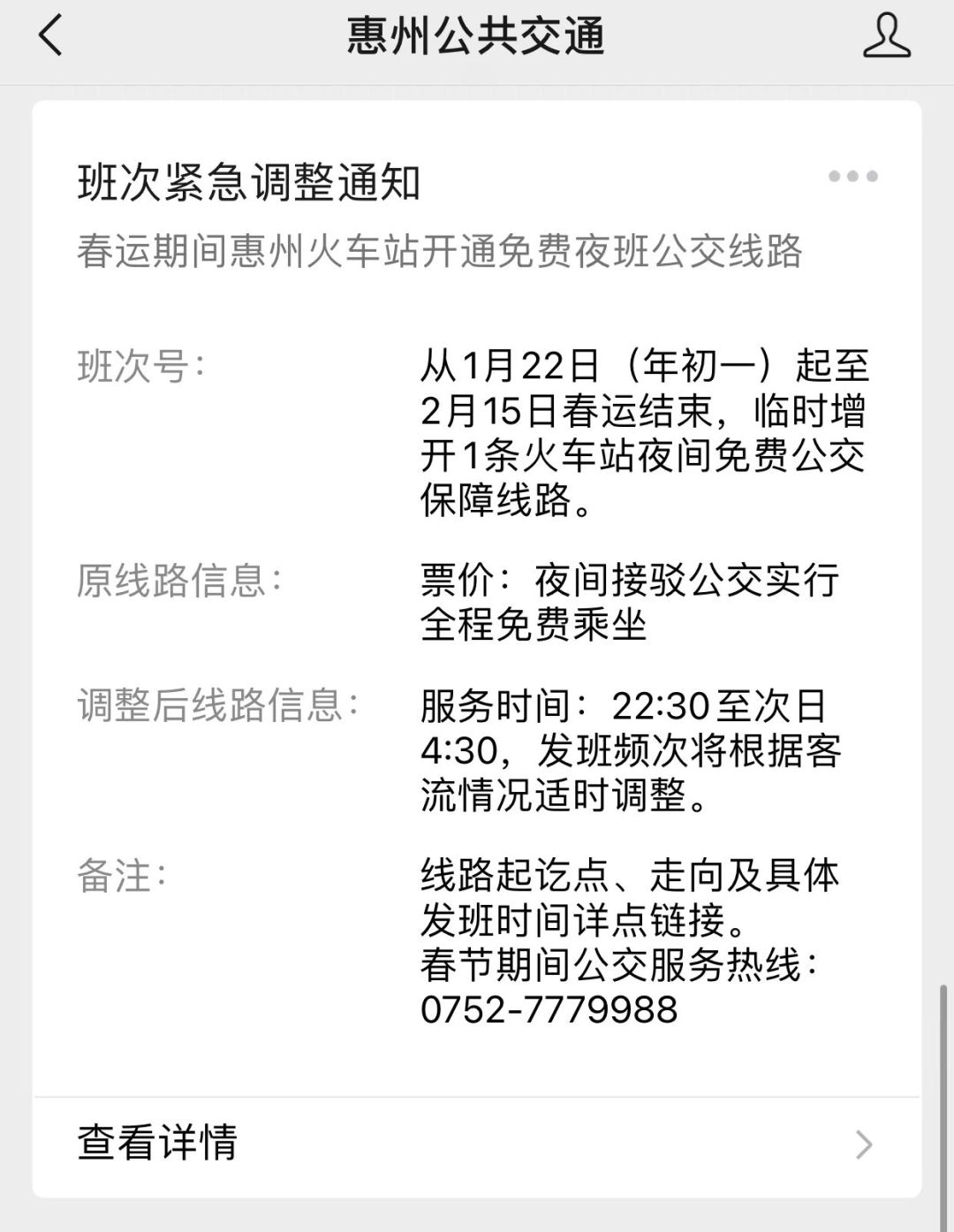 為保障火車站夜間旅客出行,避免發(fā)生旅客滯留現(xiàn)象,1月22日(年初一)起至2月15日,我市臨時增開1條火車站夜間免費公交保障線路,22:30至次日4:30,共發(fā)4個班次,發(fā)班時間為22:30、2:30、3:30、4:30(23:00-次日2:00之間無列車進站,暫停發(fā)班)。