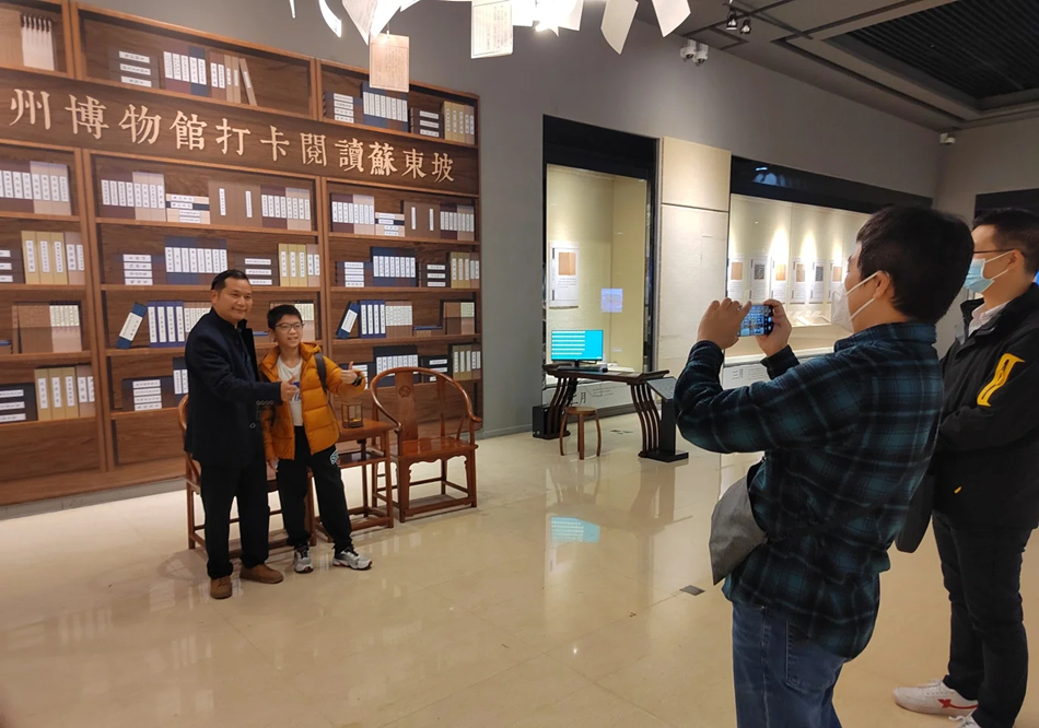 “我們是特意從深圳過來看展的,在這里,感受到惠州濃厚的東坡文化氛圍!眮碜陨钲诘年愊壬鷰е鴥鹤右黄饋韰⒂^蘇東坡文獻(xiàn)史料特展,高興地打卡拍照,今年讀五年級的兒子對著記者的鏡頭,直接背起了蘇東坡的名篇《江城子·密州出獵》。