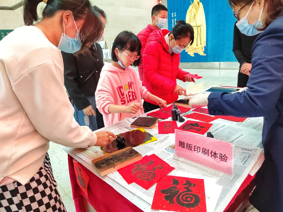 在博物館志愿者幫助指導(dǎo)小朋友進(jìn)行雕版印刷、拓片等文字化體驗(yàn)活動。