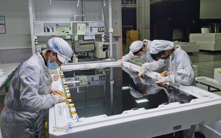 1月25日,惠州華星光電的員工春節(jié)不打烊,在車間檢查面板的外觀。