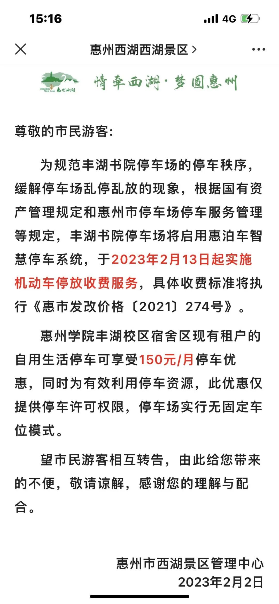 為規(guī)范豐湖書院停車場的停車秩序,緩解停車場亂停亂放的現(xiàn)象,根據(jù)國有資產(chǎn)管理規(guī)定和惠州市停車場停車服務(wù)管理等規(guī)定,豐湖書院停車場將啟用惠泊車智慧停車系統(tǒng),于2023年2月13日起實(shí)施機(jī)動車停放收費(fèi)服務(wù),具體收費(fèi)標(biāo)準(zhǔn)將執(zhí)行《惠市發(fā)改價格〔2021〕274號》。