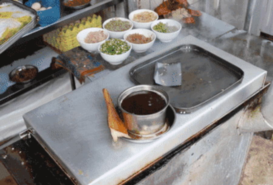 通過(guò)“雜技”般的技術(shù)動(dòng)作,讓米漿均勻的分布在簸箕面上,再加入油條、雞蛋等喜歡的配料。