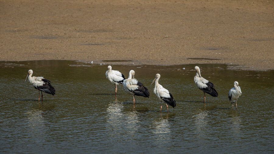 “每年秋冬,都會有候鳥飛來惠州過冬。我們在巡查濕地發(fā)現(xiàn)這群可愛的鳥類,很驚喜很意外。”莊恭濱告訴《惠州日報》記者,同行的同事徐斌是攝影鳥類愛好者,馬上拿來相機(jī)拍攝了東方白鸛鳥群,他們在江邊悠然自得棲息捕食的畫面。