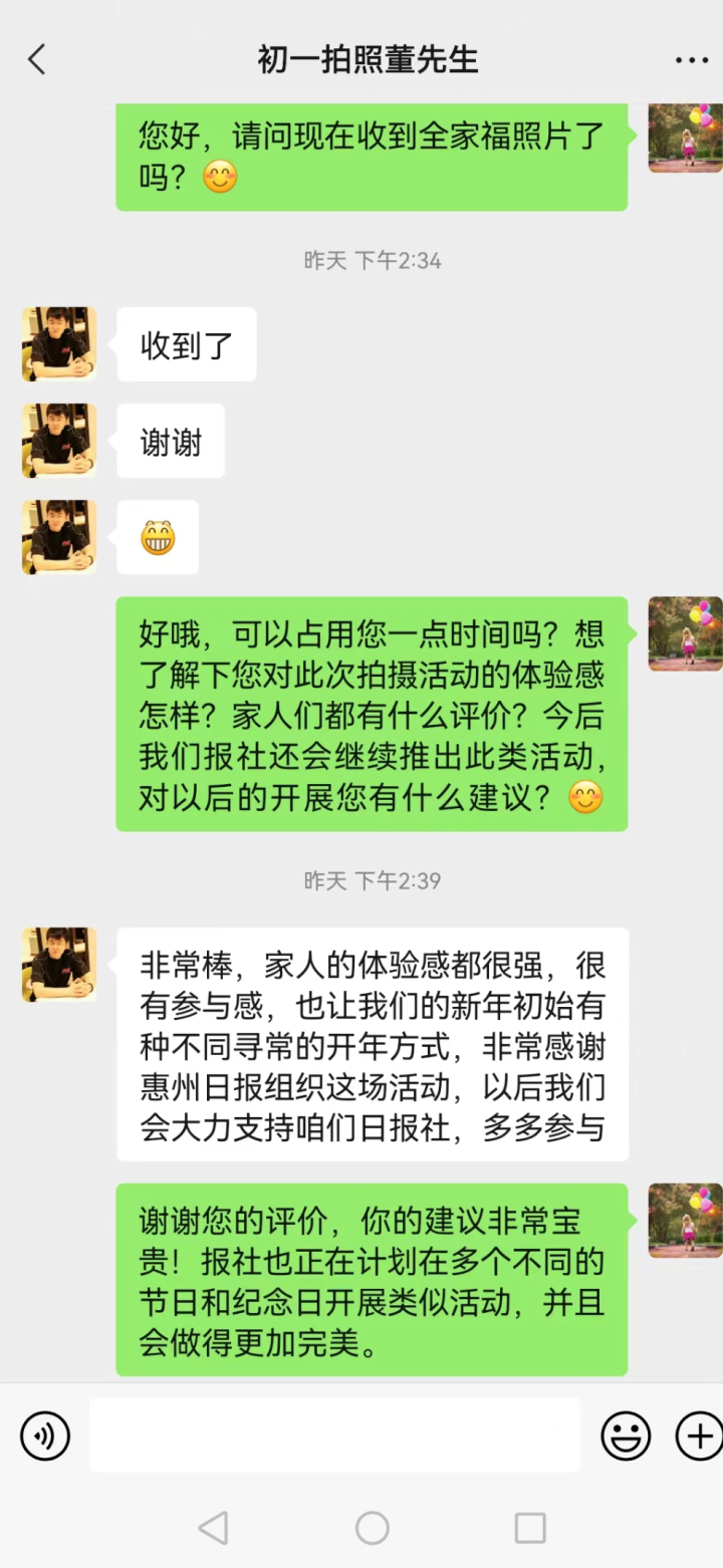 “我們家很久沒(méi)有一起拍過(guò)照片啦,拍完后爺爺奶奶都很開(kāi)心,說(shuō)太久沒(méi)有一家人整整齊齊拍過(guò)全家福啦,收到照片當(dāng)天爺爺奶奶就拿去相館裱起來(lái)了!笔忻衲麂渴指兄x惠州日?qǐng)?bào)社工作人員的付出,“你們讓惠州這座城市變得更加溫暖!”