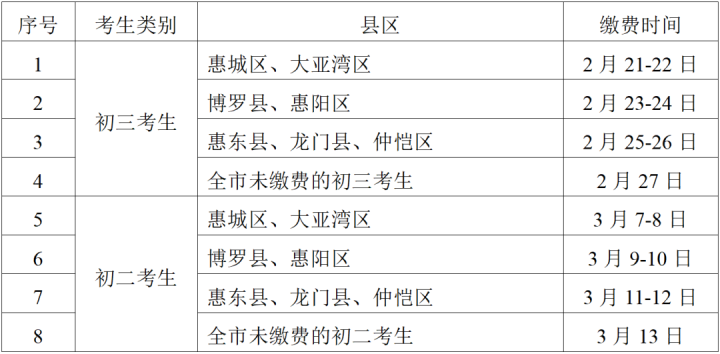 為方便考生繳費,2023年起在校生及社會考生考試費不再集中匯繳,由考生以網(wǎng)上繳費方式自行繳費。考生可登錄惠州市教育考試中心網(wǎng)站(https://www.hzkszx.com),進(jìn)入中考報名系統(tǒng)查詢“繳款識別碼”,進(jìn)入“廣東省公共服務(wù)支付平臺”完成繳費;蜿P(guān)注“廣東財政”微信公眾號,點擊“政府服務(wù)—公共支付服務(wù)—其他”,輸入身份證號之后進(jìn)行繳款通知書查詢及微信支付。初三考生繳費時間為2月21~27日,初二考生為3月7~13日。為避免系統(tǒng)擁塞,各縣(區(qū))分批繳費。