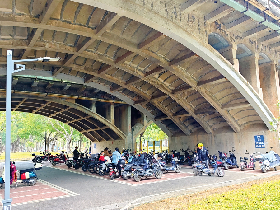 市民自覺(jué)把電動(dòng)車、自行車停放在公園指定區(qū)域。