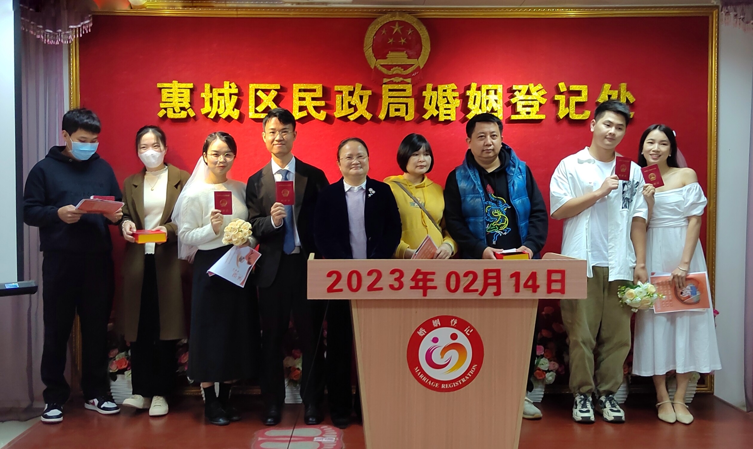 2月14日,惠城區(qū)婚姻登記處共為130對新人辦理婚姻登記。記者從市民政局了解到,當天惠州各縣(區(qū))民政局婚姻登記處同步舉行集體頒證儀式,全市共有400多對新人集體登記領(lǐng)證。