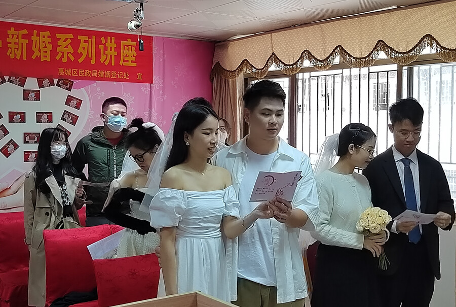 惠州日報訊 (記者陳春惠)人間自是多歡喜,共度余生路漫漫。2月14日,在這個特殊的時間節(jié)點,惠城區(qū)婚姻登記處迎來了新人登記結(jié)婚的小高峰,130對新人攜手步入婚姻殿堂。為了滿足新人結(jié)婚登記需求,惠城區(qū)民政局為新人開展了系列婚姻講座并為新人集體頒發(fā)結(jié)婚證。當天,我市各縣(區(qū))民政局婚姻登記處同步舉行集體頒證儀式,全市共有400多對新人集體登記領(lǐng)證。