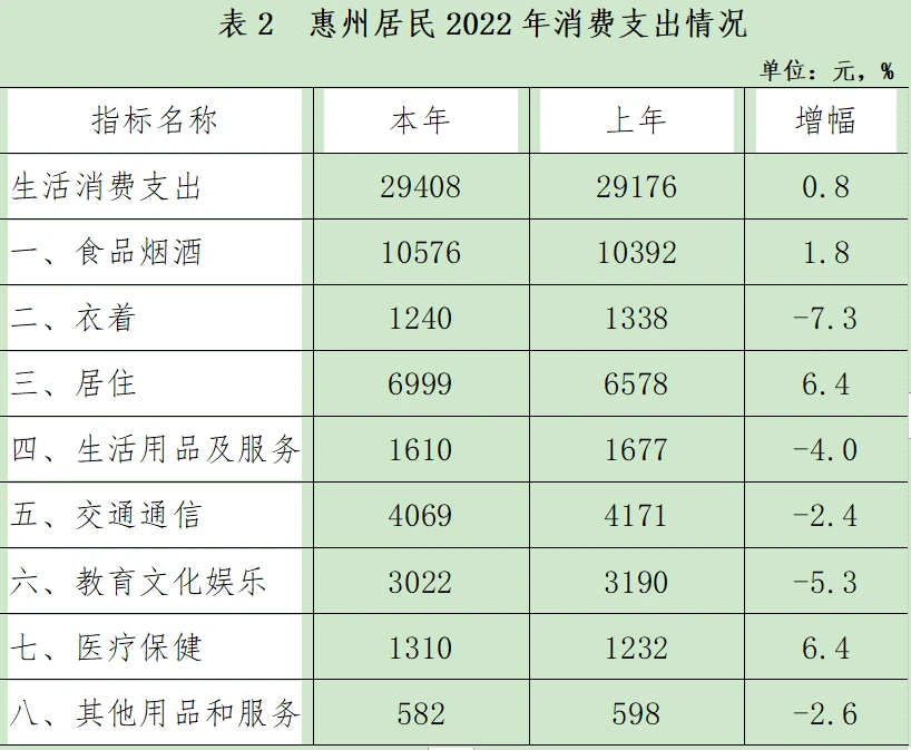 數(shù)據(jù)顯示,2022年,惠州消費品市場小幅波動起伏,全市社會消費品零售總額2040.52億元,同比增長3.1%;葜菥用袢司钕M支出29408元,同比增長0.8%,增速有所放緩。分城鄉(xiāng)來看,城鎮(zhèn)居民人均生活消費支出37579元,同比增長0.5%;農(nóng)村居民人均生活消費支出20879元,同比增長2.0%。