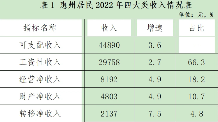 2022年,惠州居民四大類收入呈均衡增長態(tài)勢。其中,工資性收入拉動居民收入增長的主要動力。