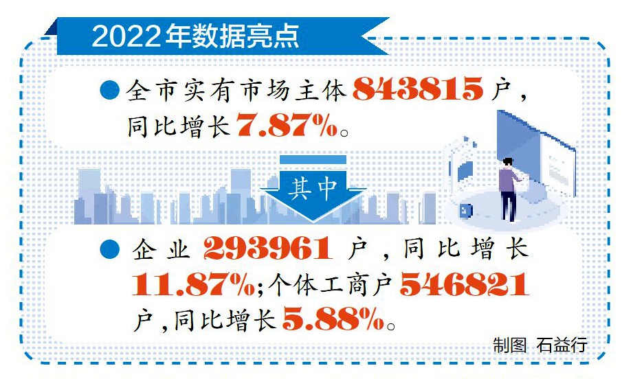 據(jù)統(tǒng)計(jì),2022年,全市實(shí)有市場主體843815戶,同比增長7.87%。其中:企業(yè)293961戶,同比增長11.87%;個(gè)體工商戶546821戶,同比增長5.88%。2022年,全市新登記各類市場主體135248戶,其中新登記企業(yè)63105戶,個(gè)體工商戶71895戶。