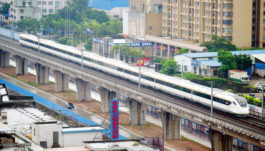 疾馳中的莞惠城際列車。 惠州東江圖片社供圖