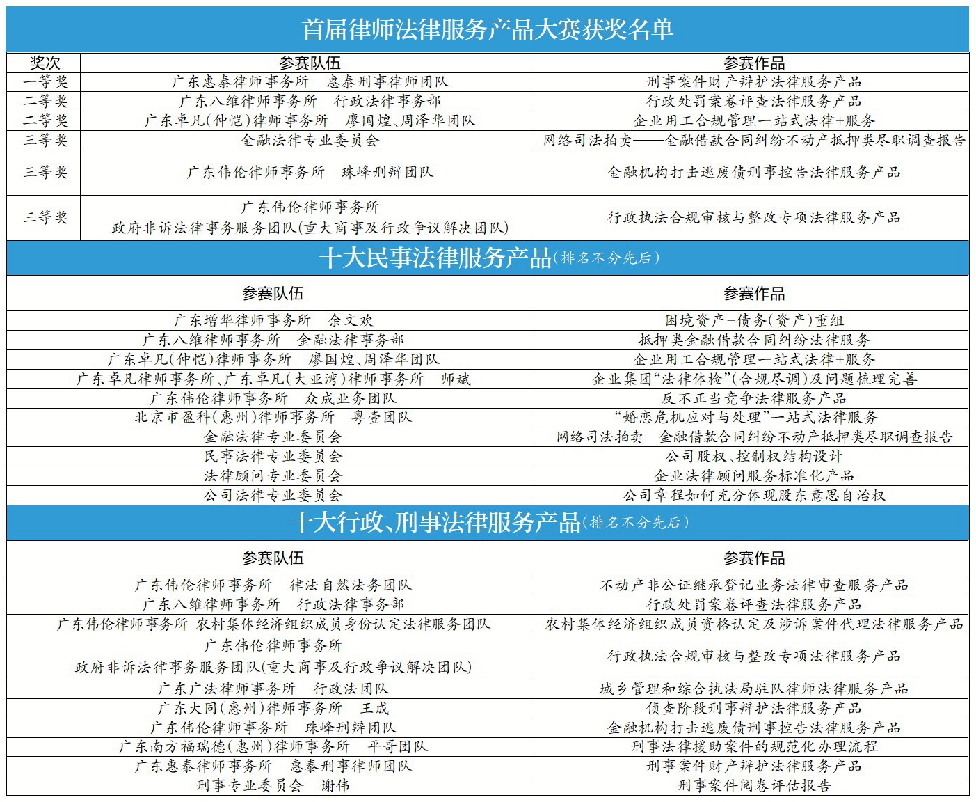 一等獎1名、二等獎2名、三等獎3名,同時公布“十大民事法律服務(wù)產(chǎn)品”“十大行政、刑事法律服務(wù)產(chǎn)品”獲獎名單