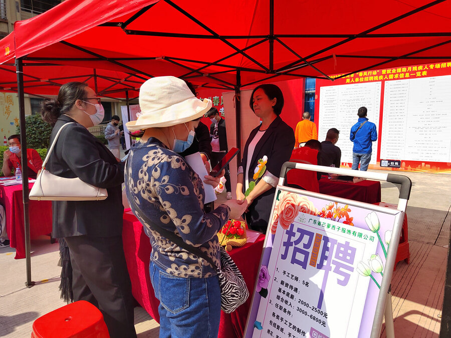 “哇,這些手工花好漂亮!被顒蝇F場,不少殘疾人及家屬看到一朵朵精致的手工鉤花,稱贊不已!斑@些手工花都是我們殘疾員工制作的,你們感興趣也可以前來學習!睆V東省苧蘿西子服飾有限公司負責人焦艷紅向前來求職的殘疾朋友們介紹,公司除了從事服裝服飾制造和批發(fā),還有各類手工藝的制作,包括剪紙、手工鉤花、繡花等!拔覀儾粌H提供原材料,還包培訓,殘疾朋友們學會后還可以在家制作,我們對產品進行包銷!苯蛊G紅表示,目前公司就有幾名殘疾人,他們的動手能力并不比常人差,做出來的手工花特別好看。